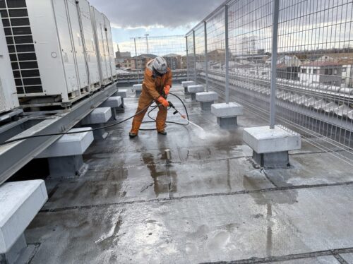 仮設足場を設置した後に、屋上から高圧水洗をしていきます!