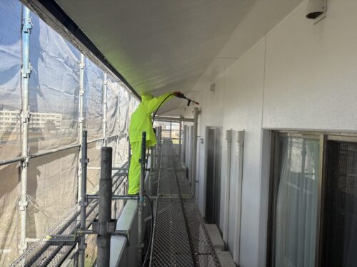 長年の埃が溜まっていたり、劣化のサインである「チョーキング」が出ていたので、塗料の密着性を高めるために洗い流します。