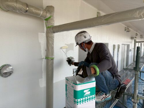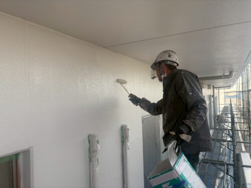 エスケー化研『ミラクシーラーエコ』を塗り、下地を強化させて上塗りとの密着性を向上させました。