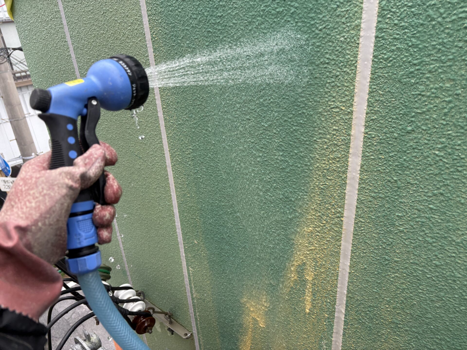 コーキング作業をしたのち、外壁の水洗作業をしていきます。