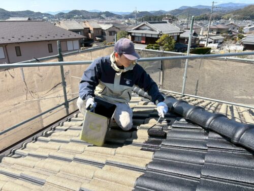 F様邸の屋根は平板スレートで、『マイルドシーラー』を下塗りして、エスケー化研『プレミアムルーフSi』を上塗り2回塗りしました。