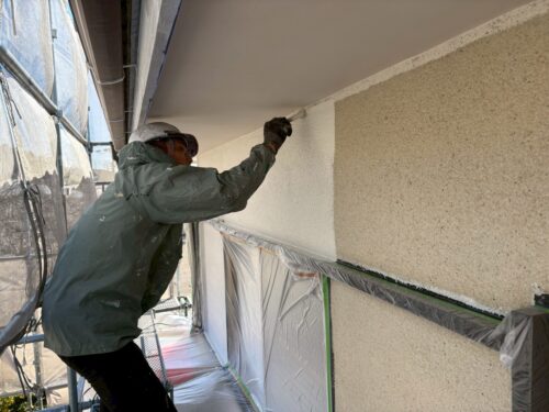 下塗りにシーラーをしっかり浸透させるように塗り、エスケー化研『アートフレッシュ』を上塗り2回塗りです。