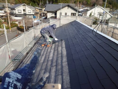 上塗りはエスケー化研『プレミアムルーフSi』を2回塗りです。