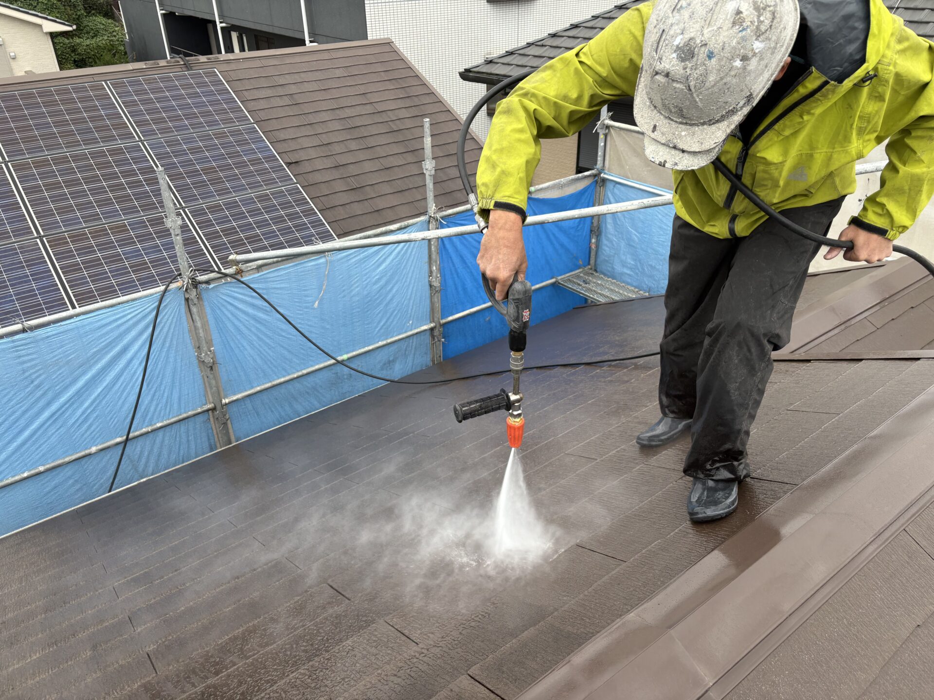 まずは塗装する場所を高圧洗浄機を使用して水洗いしていきます。