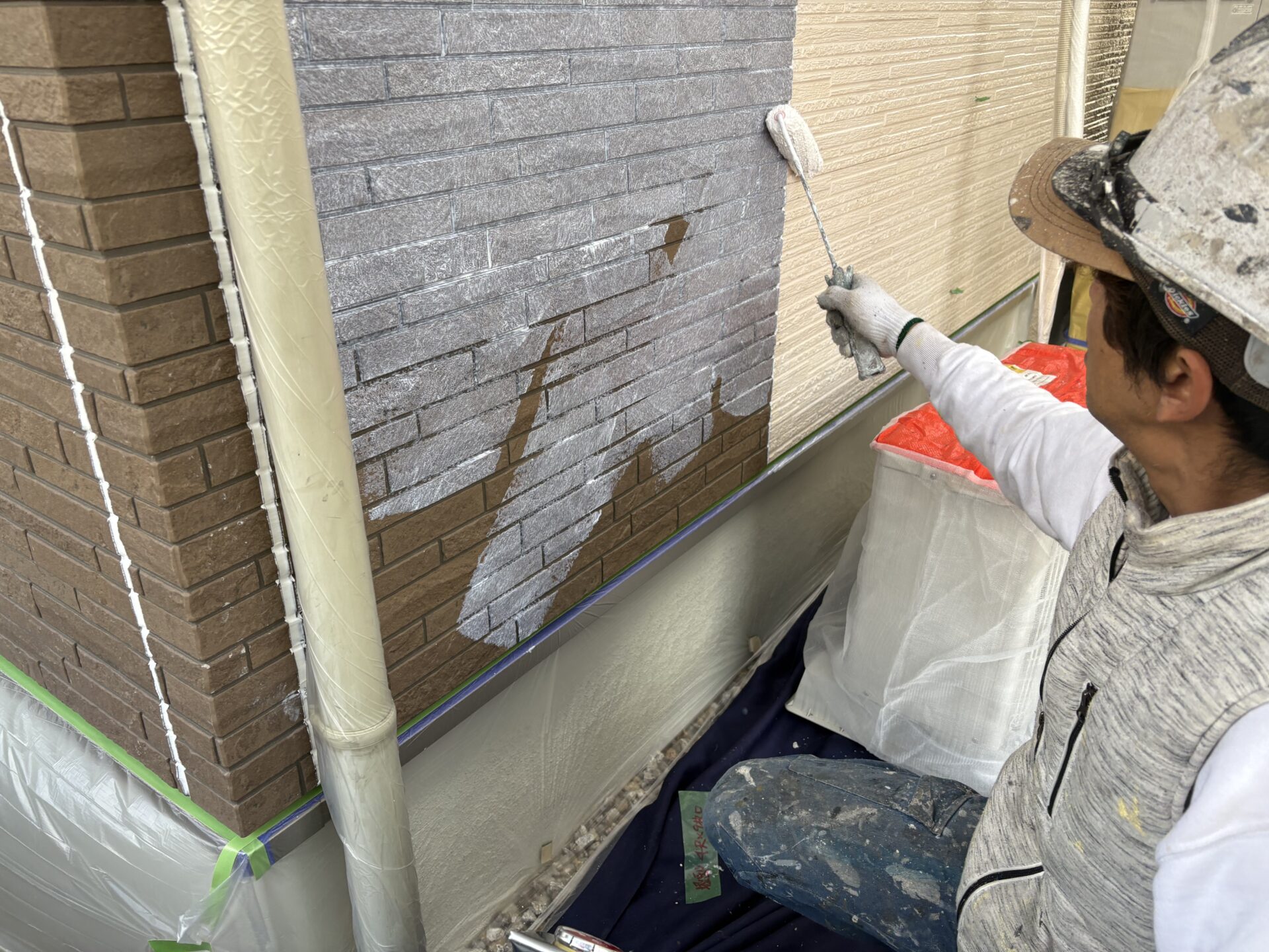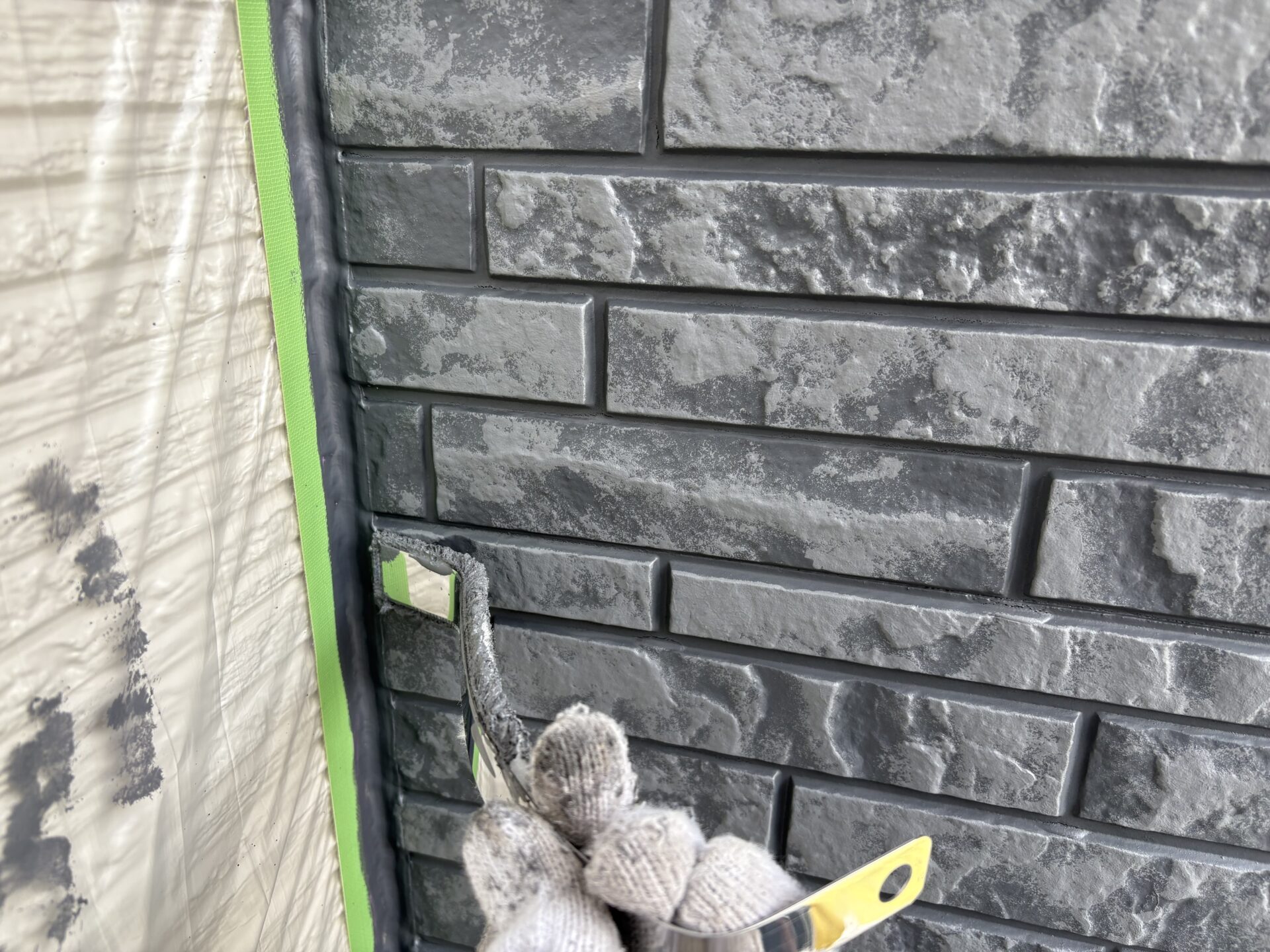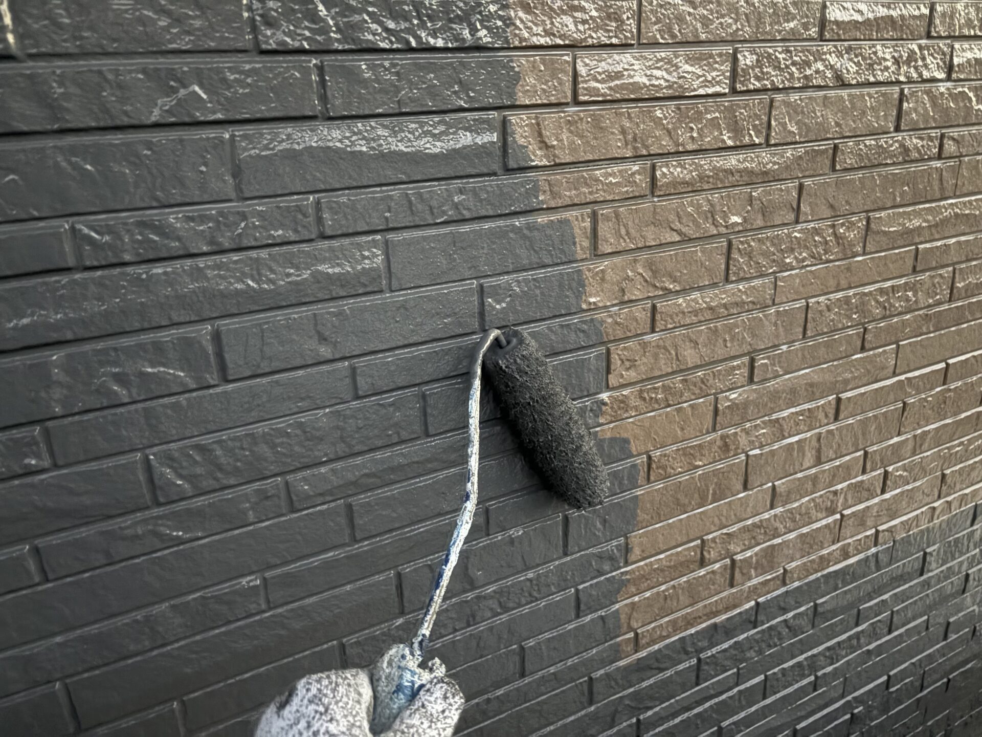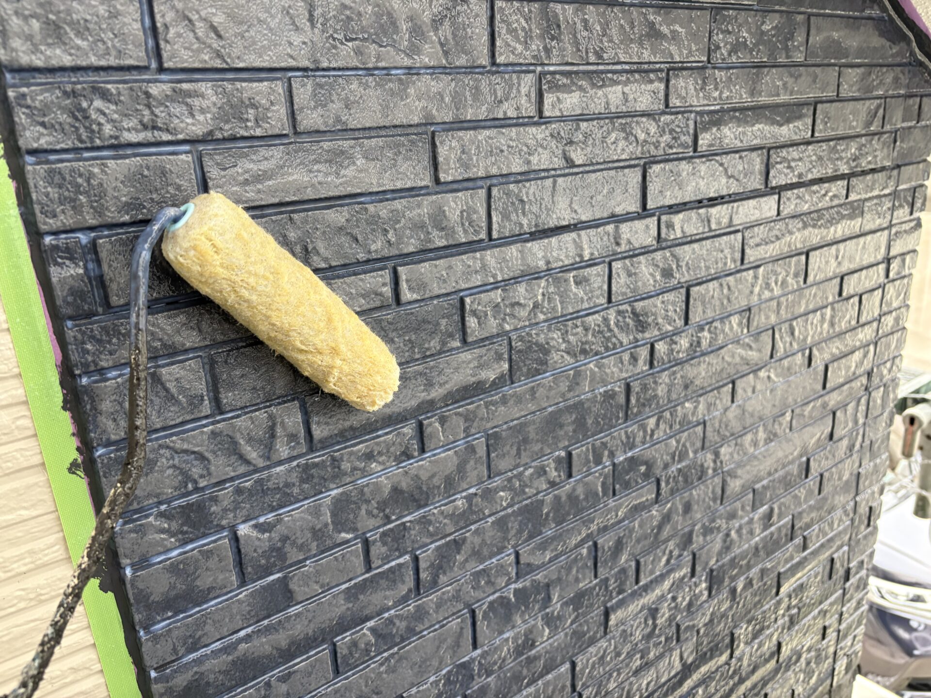 凹凸の深いサイディングだったのでローラーだけでは柄が付けにくかったため、色々と道具を駆使してバランスを取りながら施工していきました!