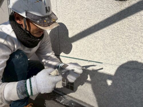 専用のプライマーを小口に塗り、密着性を高めてからシーリングを充填です。