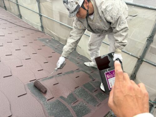 屋根塗装は、エスケー『マイルドシーラー』を下塗りして、『プレミアム無機ルーフ遮熱』を上塗り2回塗りしました。