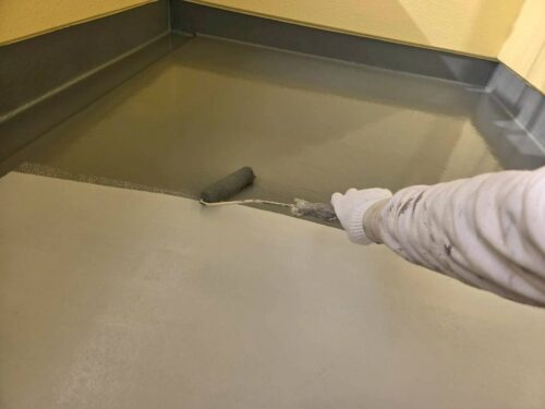 ベランダ床塗装は『アセトン』で脱脂工程を経て、大同『塗り替え用プライマー』下塗りをして『ユカクリートAU』を上塗り2回塗りしました。