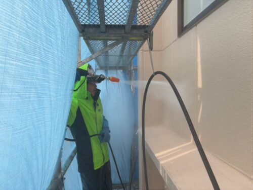 高圧洗浄をすると、どうしても洗浄した汚水が飛散してしまうので、未然にトラブルを防ぎ施工していきます。
