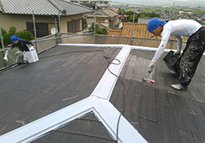 屋根塗装は、薄型瓦部分はエポキシシーラー下塗(透明)、水切り鋼板部分は エポキシ錆止め(白色)下塗の上、弱溶剤2液性遮熱シリコン(クールタイトSI)を2回塗りしました。