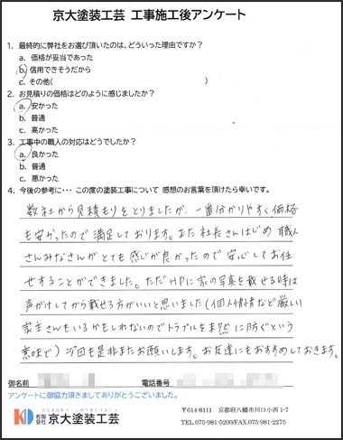 数社から見積もりをとりましたが、一番分かりやすく価格も安かったので満足しております。また社長さんはじめ職人さんみなさんがとても感じが良かったので安心してお任せすることができました。ただHPに家の写真を載せる時は 声がけしてから載せる方がいいと思いました(個人情報など厳しい家主さんもいるかもしれないのでトラブルを未然に防ぐという意味で)次回も是非またお願いします。お友達にもおすすめしておきます。