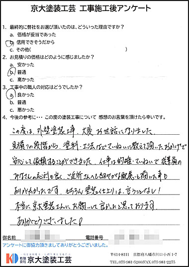 本当に京大塗装さんにお願いして良かったと思ってあります。ありがとうございました!