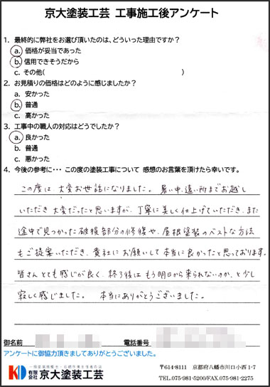 この度は大変お世流になりました。暑い中、遠い所までお越しいただき大変だったと思いますが、丁寧に美しく仕上げていただき、また途中で見つかった破損部分の修復や、屋根塗装のベストな方法もご提案いただき、貴社にお願いして本当に良かったと思っております。